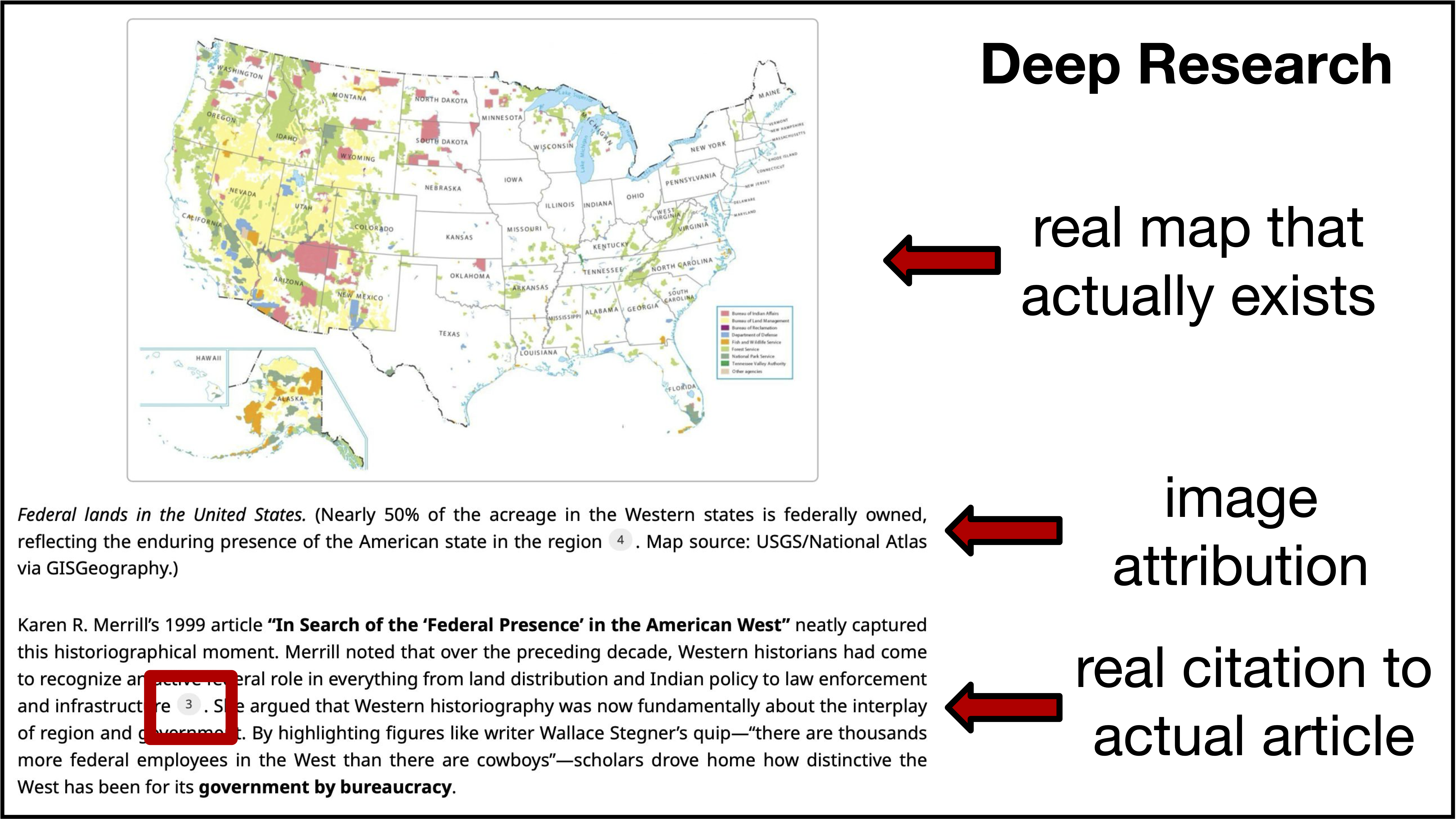 The report hit many of the major of the historiographical notes I would hope to see on this topic, from Frederick Jackson Turnerâs âfrontier thesisâ to American Political Development (APD) literature to the âNew Western Historyâ of the 1980s and 1990s to the more recent framework of âGreater Reconstruction.â It referenced work from a wide range of credible historians (Stephen Aron, Brian Balogh, William Cronon, Gary Gerstle, Sarah Barringer Gordon, Kelly Lytle HernĂĄndez, Beth Lew-Williams, Patricia Limerick, Benjamin Madley, Noam Maggor, Karen Merrill, William Novak, Margaret OâMara, Elliott West, Richard White). There were no glaring mistakes, no fabricated citations to non-existent sources, no â10 Amazing Facts About the Wild Westâ websites - all things you would have found in a similar AI-generated essay in 2024. Hell, it even located and inserted (with full attribution) a map of federal land in the West, providing a compelling visual example of the stateâs presence in the region: