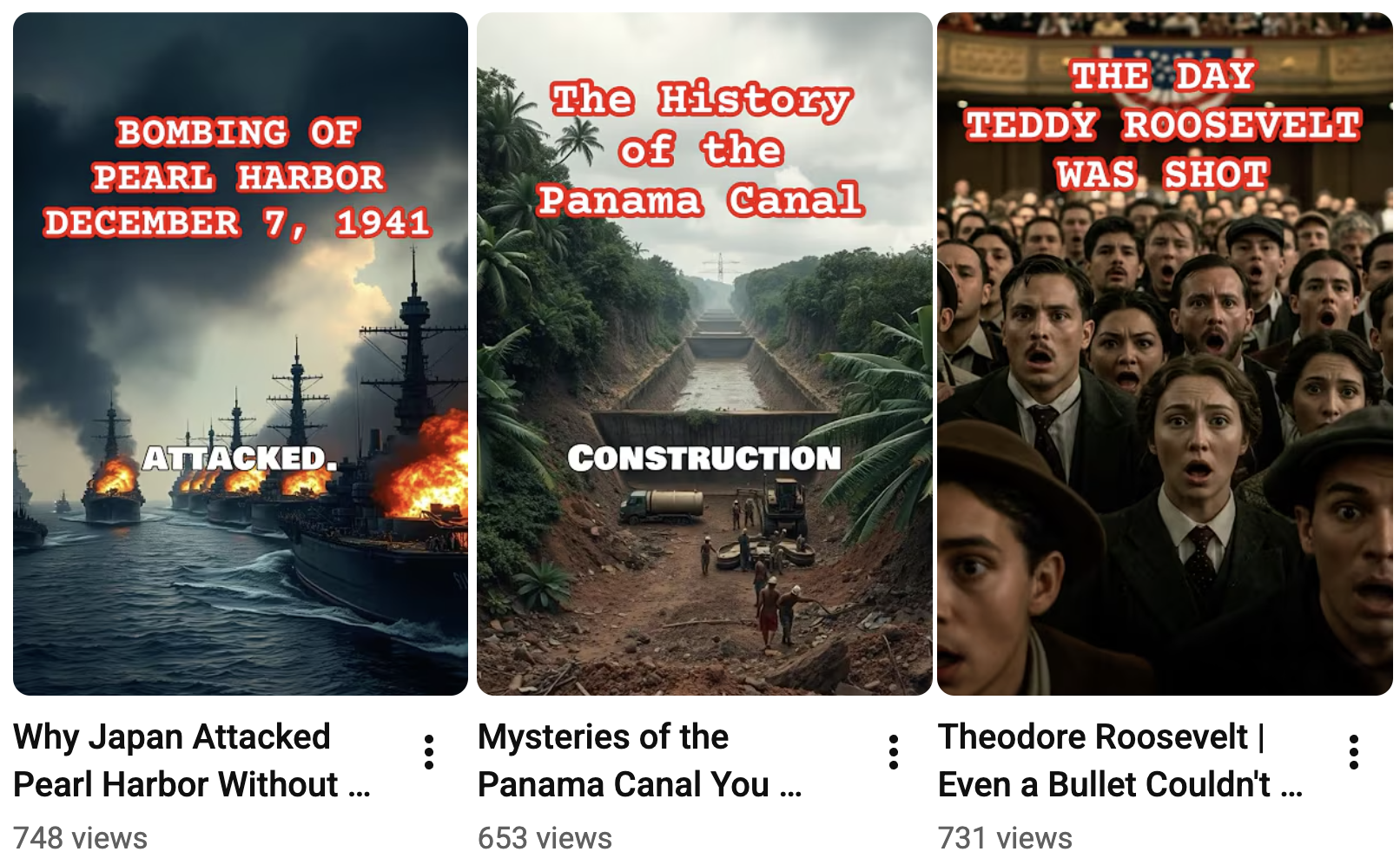 Try searching YouTube for a historical event or historical figure and then filter your results to the last year of uploads; you will soon find yourself scrolling past AI-generated videos posted by users like ALLUSHISTORY or AmericanHistoryBufff: